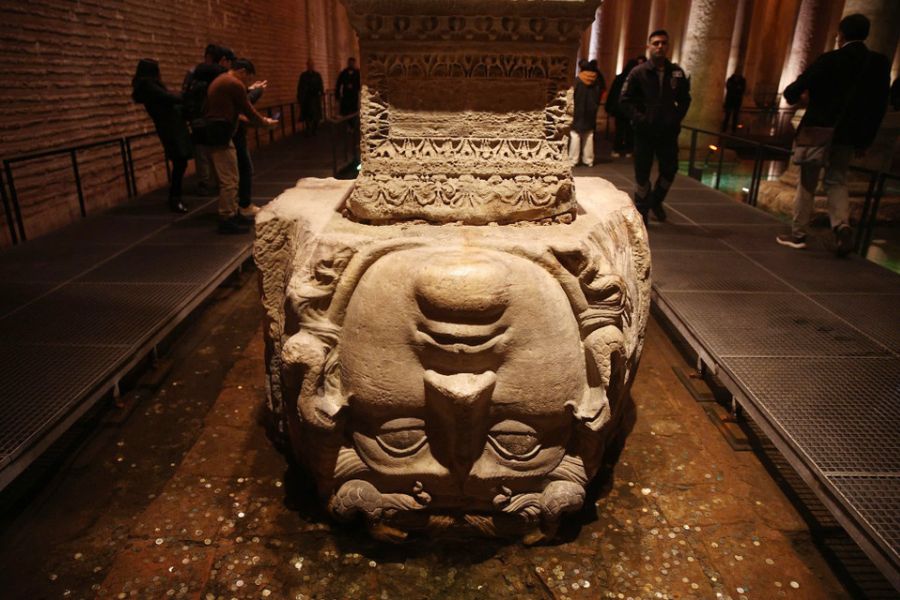Hai khối đá chạm hình Medusa được đặt làm chân cột – một quay ngang, một úp ngược. Cho đến nay, nguồn gốc và ý nghĩa của chúng vẫn là một bí ẩn, góp phần làm tăng sức hút cho công trình.