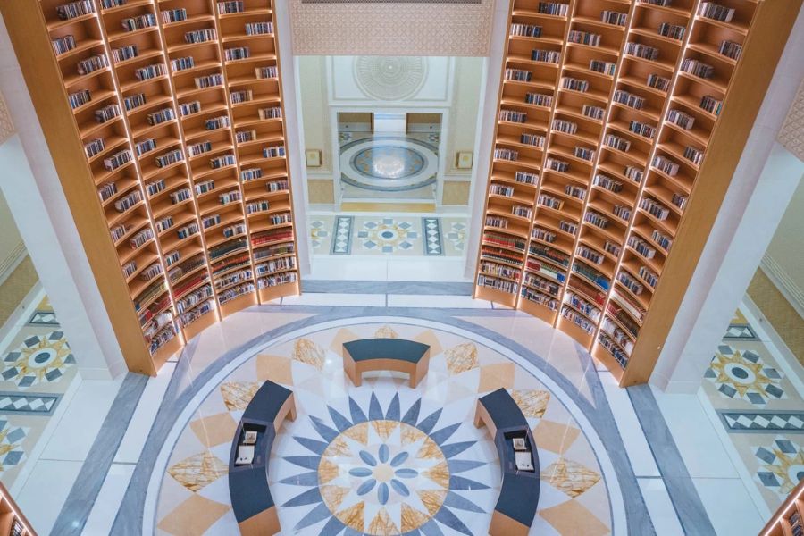 “Một trong những không gian đặc biệt nhất tại Dinh Tổng thống UAE chính là Thư viện Qasr Al Watan – biểu tượng của tri thức quốc gia.Nơi đây lưu giữ hàng nghìn đầu sách về lịch sử, chính trị, luật pháp và khoa học, phản ánh hành trình phát triển của UAE qua từng giai đoạn.