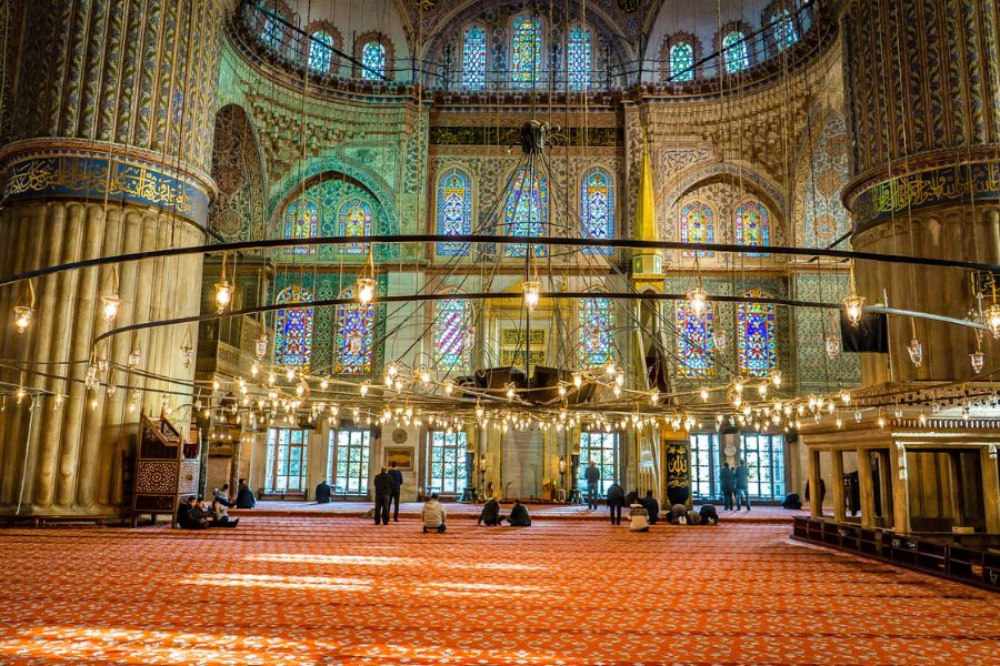 Không gian nội thất của thánh đường Blue Mosque được kiến tạo dựa trên sự tính toán tinh tế về ánh sáng tự nhiên, với hệ thống hơn 260 cửa sổ kính màu bố trí khắp các tầng mái vòm. Đây không chỉ là giải pháp chiếu sáng, mà còn là một phần quan trọng trong triết lý kiến trúc Hồi giáo Ottoman.